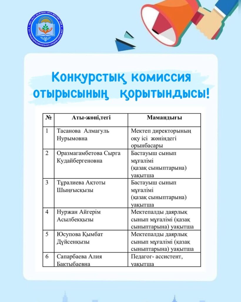 Іріктеу нәтижесінде жұмысқа қабылданған педагог мамандарға