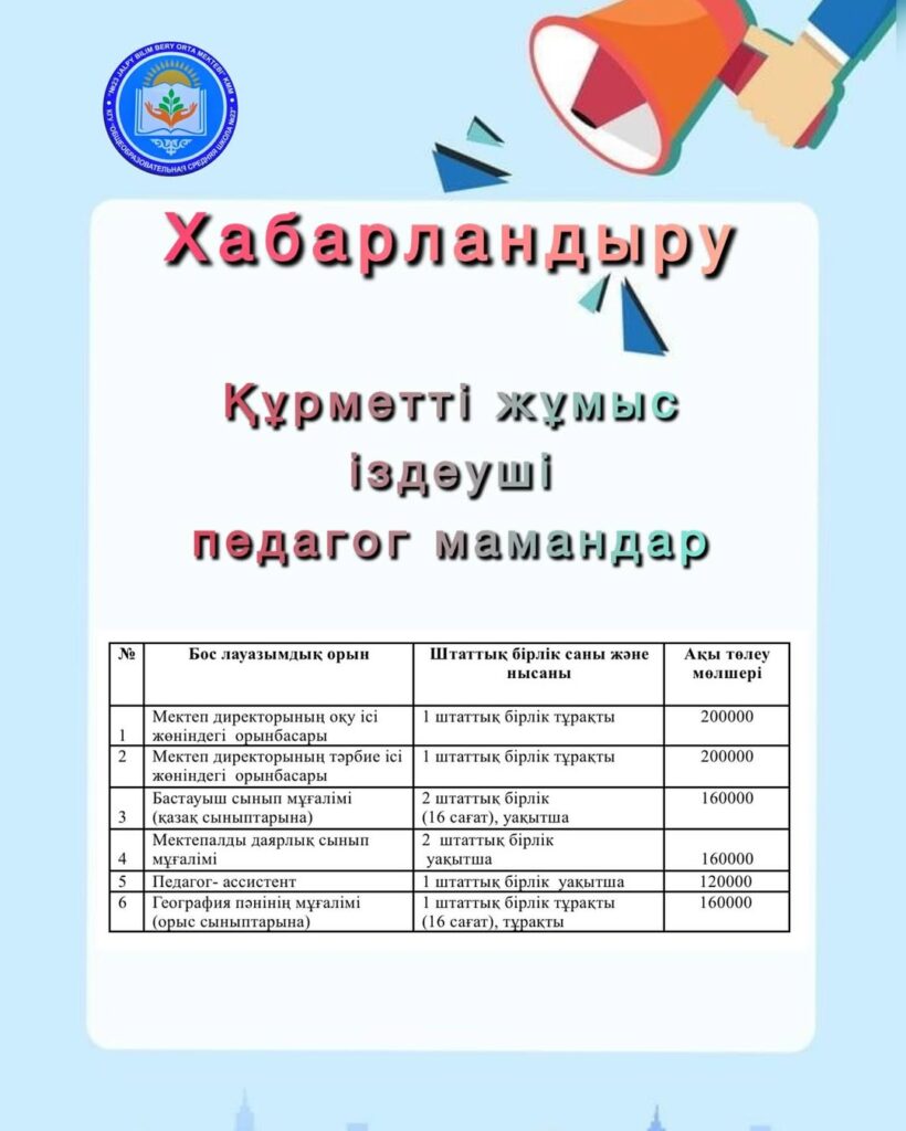 Конкурсқа қатысатын педагогтар Қазақстан Республикасы Білім және ғылым министрінің 2009 жылғы 13шілдедегі «Педагог лауазымдарының үлгілік біліктілік сипаттамаларын бекіту туралы» №338 бұйрығында көзделген біліктілік талаптарына сәйкес келуі тиіс. Құжаттарды қабылдау 18.08.2025ж-26.08.2025ж аралығында жүргізіледі.